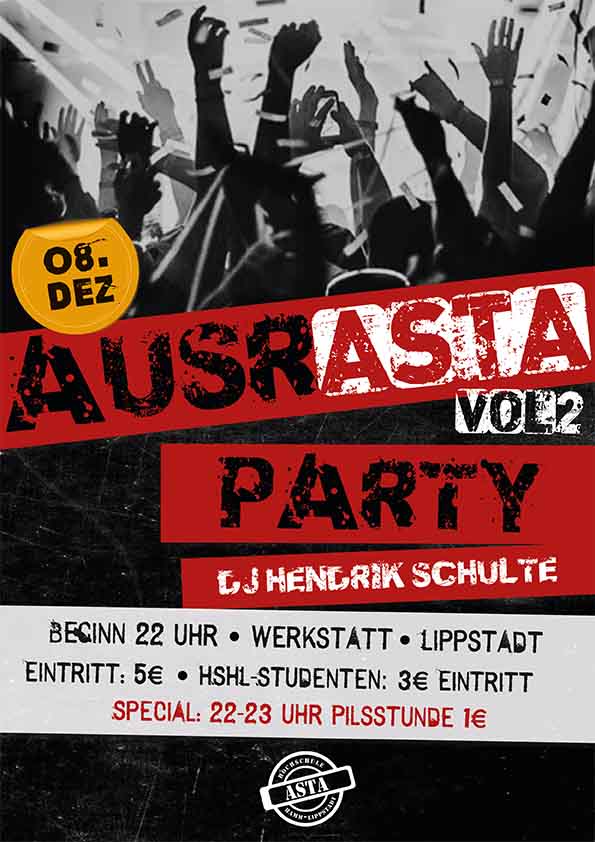 Weil es wieder so gut angekommen ist, geht die AUSRAStA Party des AStA der Hochschule Hamm-Lippstadt in die zweite Runde. Mit dabei ist diesmal HD music im Doppelpack! Es bleibt also definitiv kein Stein auf dem anderen. Los geht’s wie immer um 22 Uhr in der Werkstatt Lippstadt.